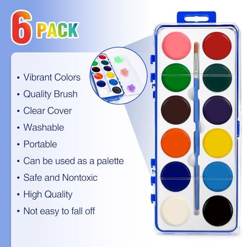 6 Pack Watercolor Paint Set for Kids, 12 Colors Watercolors Paints with Paint Brush, Kids Watercolor Paint Set for Party Favor, Classroom.