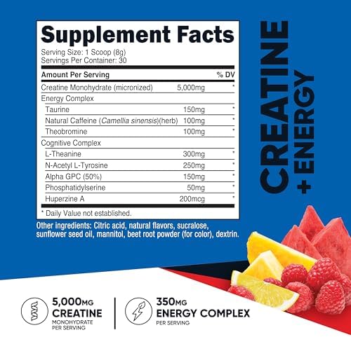 - Each serving delivers 5,000mg of creatine monohydrate and 350mg of an energy complex.