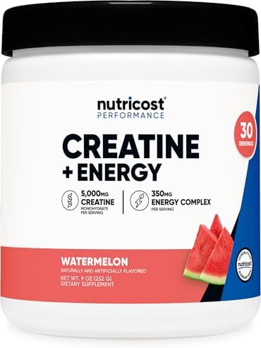 Nutricost Creatine + Energy 30 Servings (Watermelon Flavored) - 5,000mg Creatine Monohydrate + 350mg Energy Complex Per Serving