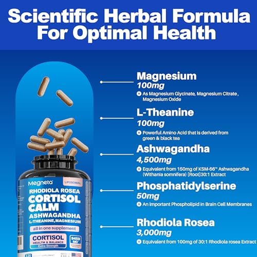 - 16-in-1 Formula: Cortisol supplement with 16 valuable ingredients, including 100mg Magnesium, 150mg Ashwagandha, 100mg L-Theanine, and 100mg Rhodiola Rosea. MEGNETA cortisol calm helps you manage cortisol levels, saving you time and effort while meeting multiple health needs