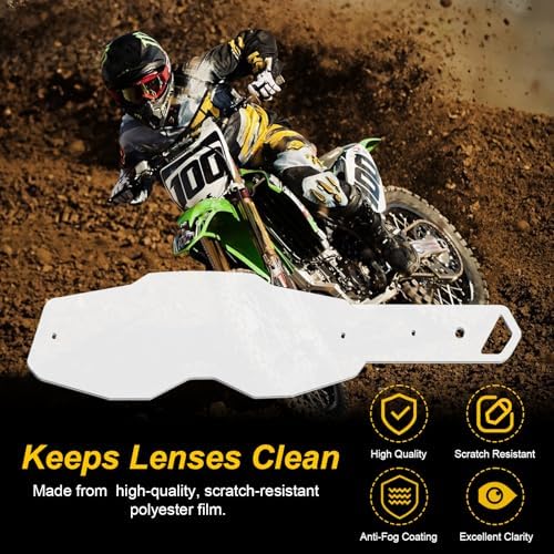 【Compatible with 100% Gen 2 Goggles】These standard tear offs are specifically designed for 100% Strata 2 (ST2), Accuri 2 (AC2) and Racecraft 2 (RC2) motocross & mountain bike goggles. They provide an exact fit to the lens interface, ensuring secure installation and effortless tearing. 【Replacement for 100 Percent Tearoffs】Fits rc2 tear offs are used to cover motocross and mountain bike goggles to protect lens from scratches and smudges. Maintain clear vision throughout your off-road adventures. The perfect defense against trail impacts for enduro, downhill, and motocross riders. 【High Quality Goggle Tear Off】These replacement for 100% tear offs are made from high-quality, scratch-resistant polyester film. These 100 tear offs maintain a clear view while protecting your goggle lens. Each layer is anti-fog treated and ultra-thin (0.1mm) for minimal visual distortion, ensuring continuous, clear vision at the most critical moments of your race. 【Precise Fit】The tear offs for goggles features a precise fit to the lens interface structure, ensuring stable installation and smooth tearing. The static-cling design ensures bubble-free adhesion without sticky residues. Each stack has a strip of clear adhesive around the bottom creating a seal between the lens and tear-off stack once installed, a simple tear ensures your view is unobstructed.