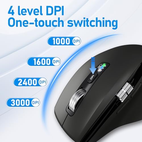 - 4-level DPI: Settings (1000/1600/2400/3000) DPI to meet your multiple needs, either for daily work. Silent wireless bluetooth mouse can be used on any computer desktop and mouse pad. Move the mouse to wake up the screen.