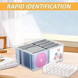 Set of 3 CD Organizers: This package includes 3 CD storage units: 1 CD storage box with a lid and 2 7-slot CD racks. Each CD display rack can hold up to 14 standard-sized CD cases (2 per compartment), giving you a total capacity of 28 CD cases. The compartment CD holders can also be placed inside the CD box for easy organization. Large Capacity: The clear plastic CD organizer measures 11.9 x 8.5 x 5.5 inches and can hold up to 30 standard-sized CD cases. The CD storage container shelf measures 6.7 x 4.9 x 1.6 inches, with 0.8-inch spacing between compartments, each capable of holding 2 standard CD cases. Be sure to check the product dimensions before purchasing. Acrylic CD Organizer: Made from high-transparency, durable, BPA-free acrylic material, the CD storage box, and racks allow you to easily view CD titles through the sides. Keep your collection visible, organized, and easy to access, making it simple to find and retrieve your CDs. Waterproof & Dustproof: The latch closure on the CD organizer bin helps keep dust and debris out, keeping your CDs, DVDs, movie discs, tapes, and VHS tapes in pristine condition. The acrylic DVD/CD storage box is ideal for use in home theaters, living rooms, and game rooms. Stackable Design: This CD storage organizer set is not just for CDs. Our clear acrylic CD holders are also great for DVDs, cassette tapes, or small office supplies. The stackable design helps save space and keeps your space neat and organized.