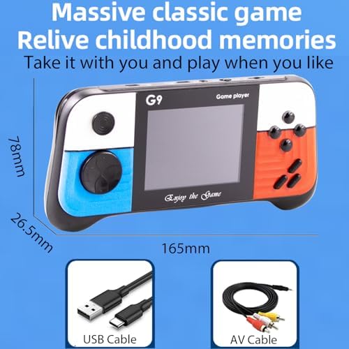 handheld game console, retro game console built-in 400 classic games, best gift Birthday Christmas Presents for Friends and Adults It is with a protective film on the screen, you may take it off when you the get the retro FC game console. Handheld Game Console Poduct Introduction: Languages: English and Chinese Screen: 3.0 Inch Built-in:400 games Speaker: Yes Working time: 5 hours Battery: Built in 500mAh rechargeable polymer battery Portable Handheld Retro Game Console Note: 1.Before connect to a TV.make sure that your TV and the unit are turned off. 2.turn the channel on TV to the Audio/Video channel. 3.The game console does not have the function of saving the progress of the game. When you quit the game, all progress will be zero. 4,Please read the instructions carefully before use! Notice: 1.Do not short circuit battery contacts 2.Do not dispose of batteries in fire 3.Remove the batteries from the unit if sit will not be used for an extended period of the time. Accessories : 1 x Retro game console 1 x User manual 1 x USB Cable 1 x AV Cable