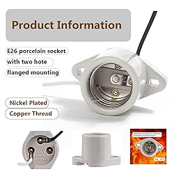 MOUNTING: Surface mount design with flanged base allows for easy installation on walls, ceilings, or other flat surfaces QUALITY MATERIAL:These US standard medium screw base E26 light socket is made of porcelain housing, which has excellent high temperature resistance. Electric Rating: 600V 660W, The porcelain material and copper thread carries high electric current which is safe to work with tranditional halogen bulb,incandescent bulb, CFL and LED standard screw in (E26) light bulbs. WIDE APPLICATION:The porcelain light socket is a good replacement for broken light sockets or making a new lamp which light socket mount on surface direct,can install it in your home, garage, office, etc. PACKAGE INCLUDED:2 keyless porcelain light socket, comes with 15 cm/ 6 inch length wire,Mounting Hardwares Included 2 Lock Screws and 2 Wire Connectors for each lamp socket to secure your installation needs either new DIY project or old lamp repair.