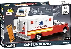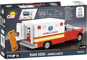 - Designed with saving lives in mind, the RAM 3500 Ambulance model in 1:35 scale is a unique set for motoring and building enthusiasts. The model consists of 295 precisely designed elements that faithfully reproduce the appearance of a powerful ambulance. Realistic body details, special medical construction and characteristic prints give the model an authentic look. Rubber tires and rotating wheels make the vehicle not only durable, but also great for dynamic play. You can look inside through the removable roof and opening rear doors! The set also includes a figure of an American paramedic with a stretcher! RAM 3500 Ambulance is not only an attractive set for play value, but also an excellent item for collectors. Complete your COBI collection in 1:35 scale with this extraordinary ambulance model that will definitely stand out among other emergency vehicles. Build it and feel like a real hero, ready for action in any situation!
