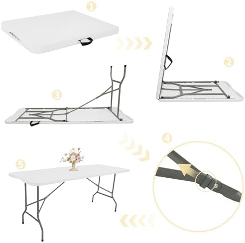 Folding Table 6 FT Lightweight Camping Table Portable Plastic Rectangular Outdoor Dining Table Steel Legs Fold-in-Half with Carrying Handle for Indoor,Picnic,Party,Wedding,Events(White)