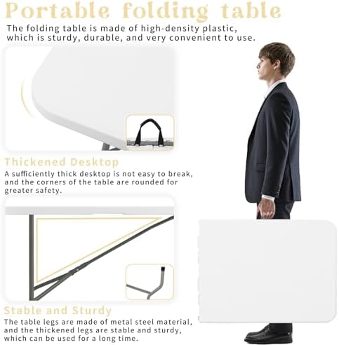 - 6 FT Folding Tables: You will receive heavy-duty folding tables measuring 6 ft/70.9 inches in length, 2.3 ft/27.6 inches in width, and 2.4 ft/29.1 inches in height. The tabletop of the table is made of high-density polyethylene material, and the support and legs of the table are made of high-quality metal steel, which is not only sturdy and durable, but also structurally stable and not easy to shake.