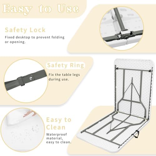 - Multi Functional Outdoor Table:The surface of this folding table is smooth and sturdy, easy to wipe, and the table corners are designed with rounded corners for safety and reliability. The anti slip covers on the four table legs prevent the table from shaking freely and protect the floor from scratches. Each table can accommodate 4-8 people, making it the best choice for outdoor camping, indoor activities, picnics, offices, birthday parties, banquets, weddings, craft fairs, kitchen table, and other events.
