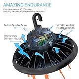 Motion Activated Function:Hyperlite high bay light is equipped with a motion sensor and remote control function. The motion sensor is pre-set to activate the lights for 30 seconds upon detecting movement, such as people, vehicles, or opening garage doors. If no movement is detected, the ufo lights will automatically turn off after 30 seconds. This feature is extremely convenient and saves time, allowing you to control the lights without having to manually flip a switch. Super Bright & Energy Saving : With just 1PCS 21000lm 150W led high bay lights, you'll achieve the brightness equivalent to a 650W traditional lamp. This not only saves on electricity bills but also operates at a remarkable efficiency of up to 140lm/w, providing a clear and bright 5000K daylight lighting effect. Enjoy low-cost operation with energy savings of up to 80%. Ideal for a variety of settings including workshops, warehouses, garages, barns, gyms, factories, supermarkets, ect. Excellent Heat Dissipation: Hyperlite UFO LED high bay light is made of aluminum, with die-casting technology, and has excellent heat dissipation performance. It has a built-in durable driver, supports AC120-277V voltage, and can be used in various places. With a service life of more than 50,000 hours, you will save replacement costs. 3 Minutes Quick Installation: Hyperlite high bay led shop lights Comes with 5ft power cord with 110V US plug, G-shaped hanging hook and safety cable. No need to worry about installation, you can easily install it in 3 minutes. The standard 3-pin plug design can save you the trouble of wiring. Equipped with a safety cable to provide double protection for the lamp, making it more stable and safe. Widely used: Hyperlite LED high bay lights are versatile and suitable for a wide range of environments, including industrial warehouses, factories, stadiums, and retail stores. With the addition of a smart motion sensor, you can work with greater convenience and efficiency, eliminating concerns about forgetting to turn off the lights and incurring unnecessary electricity costs. Start enjoying the benefits of smart bay lights today!