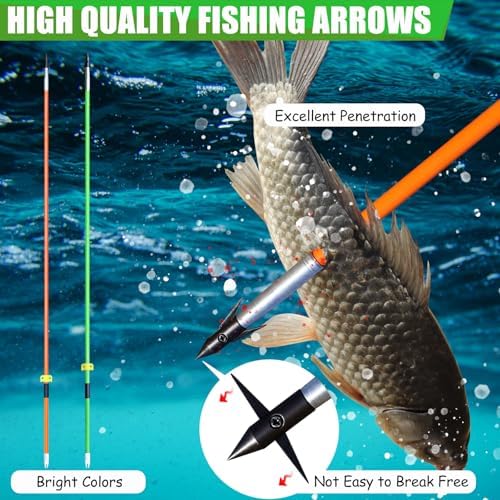 - Spine 400 fiberglass arrows (33.66”) feature detachable stainless steel tips and slip-resistant sleeves for maximum penetration. Choose vibrant orange or green shafts to track shots effortlessly in water. The uniqueblocking effect prevents fish escapes – ideal for compound bows, recurve bows, or slingshots.