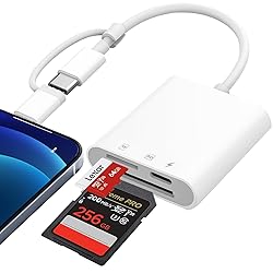 SD Card Reader for iPhone: Luonanava SD card reader has USB C & Lightning dual connectors, for iphone 5-14, iphone 15/16/17, ipad, mac, andriod phone, table type c devices. Note: two connector cannot be used simultaneously Plug and Play: The memory card reader built-in USB C and Lightning connector is easily to use, no APP, no network, no driver, no extra power. Just you can transfer photos/files from digital camera memory card to your iphone anytime, and share your moments with friends at the first time Ideal for Photography Creators: The iPhone SD Card reader is design for digital/trail/hunting camera, allowing you to instantly see the best moments of your shots! Supports two-way to stable transfer files/photos/music/video, from SD card to iphone/ipad or from iphone/ipad to memory cards.This is a useful accessories for photographers SD Card Adapter with USB-C Charging: The Digital Camera SD card reader for iPhone supports simultaneous card reading & charging, This prevents the phone from running out of power while in use. Note: SD card and MicroSD card cannot be reading at the same time Excellent Compatibility: The SD Card viewer allows you to view multiple types of SD/TF cards easily anytime and anywhere. Compatible with SD, SDHC, SDHC, SDXC, Micro SD, Micro SDHC, Micro SDXC card. Support FAT32 and exFAT formats, standard photo formats (JPEG & RAW), SD/HD video formats (H.264 and MPEG-4)