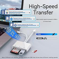 - SD Card Reader for iPhone: Luonanava SD card reader has USB C & Lightning dual connectors, for iphone 5-14, iphone 15/16/17, ipad, mac, andriod phone, table type c devices. Note: two connector cannot be used simultaneously; The SD card and Micro SD card cannot be reading simultaneously Plug and Play: The memory card reader built-in USB C and Lightning connector is easily to use, no APP, no network, no driver, no extra power. Just you can transfer photos/files from digital camera memory card to your iphone anytime, and share your moments with friends at the first time Ideal for Photography Creators: The iPhone SD Card reader is design for digital/trail/hunting camera, allowing you to instantly see the best moments of your shots! Supports two-way to stable transfer files/photos/music/video, from SD card to iphone/ipad or from iphone/ipad to memory cards.This is a useful accessories for photographers USB Female Port Extend: The card reader for iPhone/iPad also features a USB A female port, which can flexible connect USB peripheral device directly such as USB Flash disk, cameras, hard disks, mouse, keyboard and more. Bringing more choice to your iPhone and iPad Excellent Compatibility: The SD Card viewer allows you to view multiple types of SD/TF cards easily anytime and anywhere. Compatible with SD, SDHC, SDHC, SDXC, Micro SD, Micro SDHC, Micro SDXC card. Support FAT32 and exFAT formats, standard photo formats (JPEG & RAW), SD/HD video formats (H.264 and MPEG-4)
