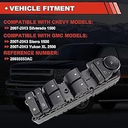 - Vehicle Fitment: window switch driver side Compatible with Chevy 2007-2013 Silverado 1500, Compatible with GMC 2007-2013 Sierra 1500, 2007 2008 2009 2010 2011 2012 2013 Yukon XL 2500 Reference Number:20835553AC,DWS1004, 1S15711, 15093440, 15906881, 20835553, 20877336, 25783951, 25976222, 920021