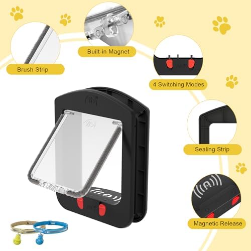 [ALUMANI] Cat Door for Interior Door and Exterior Door, 4 Way Locking Cat Door with Magnetic Flap, Collar Activated Pet Door, 2pcs of Cat Magnetic Collars, Black