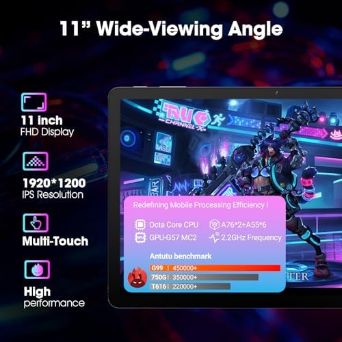 - 11-inch Tablet with Flagship MTK Helio G99(MT8781) Octa-Core Processor:Unlock desktop-level performance on this Android tablet, powered by an advanced 2.2GHz dual A76 + 2.0GHz hexa A55 CPU architecture. Engineered for lag-free gaming tablet, 4K video editing, and ultra-smooth multitasking.The MT8781 displayed in the system is the CPU model, G99 is the code, and both are the same product