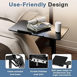 Versatile Tilting Tabletop: The innovative 0°-70° tilting design of this overbed table allows for smooth, gas spring-powered adjustments without being limited to fixed positions. This makes it perfect for a variety of activities such as reading, eating, or working on your computer, offering maximum comfort and flexibility whether you're using it as a bedside table or computer desk. Desktop Dimension: over all 27.6" x 15.7", tilting board 19.3" x 15.7", fixed board 8.3" x 15.7". Effortless Height Adjustment: Featuring a gas lift mechanism, this adjustable desk can be easily raised or lowered between 29.5" and 43.3" with just one hand—no need to bend down or struggle with manual adjustments. Ideal for use as a hospital bed table or small desk, this feature makes it perfect for those with limited mobility or anyone looking for an easy-to-adjust solution. Smooth Mobility with Sturdy Stability: Equipped with 4 hidden 360° rotating wheels, this rolling desk provides easy mobility for quick repositioning. The sturdy H-shaped base ensures stability while keeping the distance from the floor just 1.38”, allowing it to slide effortlessly under furniture and save valuable space in your room. Enhanced Durability and Safety: With an added stainless steel locking pin, this bedside table prevents the tabletop from tilting unexpectedly when in flat position, offering a safe and stable surface for all your activities. The high-quality steel material ensures smooth operation, preventing rust over time—ideal for long-term use as both a bed side table and overbed table. Sturdy & Long-Lasting Construction: The extended steel frame underneath the tilting tabletop enhances the desk's stability and prevents warping or tilting, a common issue with traditional C-shaped tables. Designed to hold up to 15kg (33lbs), this table ensures that your laptop, books, and other items are securely supported for a long-lasting, reliable workspace.