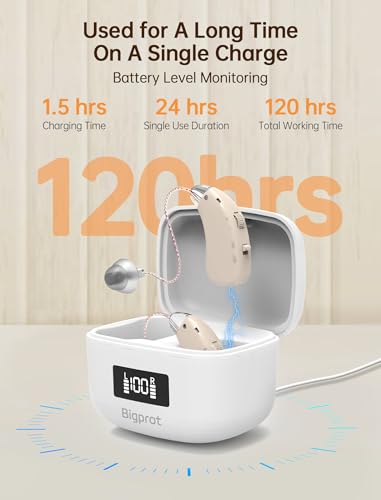 - Easy to Recharge: Charges fully in just 1.5 hours. Total up to 120hrs of hearing.The charging case features an LED display to check remaining power at a glance. With long battery life, you'll never worry about frequent charging.
