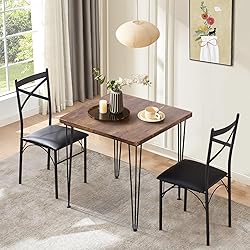 【Durable & Sturdy】This dining table set is made of high quality metal and MDF board.Table Size:29"L x 29"W x 30" H; chair size: 16 "L x 15" W x 36 "H. 【Wide Range of Uses】Suitable for kitchen dining room restaurant dorm apartment bistro, meeting your different need,this dining set seats up to 2 people with a square table. 【Comfortable Seat】The VECELO dining chairs with curved backrest and thick leather seat pads to promote comfort, giving you a comfortable seating experience. 400-pound weight capacity per chair. 【Space Saving】 2 chairs can be conveniently tucked under the dining table when not in use, which can not only maximize space utilization but also maintain the aesthetics. 【Easy to Assembly】 Packed with detailed instructions, labeled accessories and installation tools, which makes assembly simple. Thanks to the waterproof finish, you can clean it effortlessly with a damp wipe.