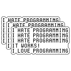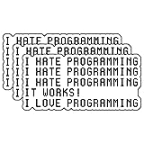 - Express the rollercoaster of emotions every programmer knows with this hilarious 3-pack of vinyl stickers! These durable decals capture the quintessential programming experience - from moments of frustration to the sweet victory of working code. Each sticker features pixel-style text that reads 'I HATE PROGRAMMING' multiple times, followed by the triumphant 'IT WORKS!' and 'I LOVE PROGRAMMING' - perfectly encapsulating the daily life of coders everywhere. These high-quality vinyl stickers are perfect for decorating laptops, water bottles, notebooks, or any smooth surface. Show off your coding humor and connect with fellow programmers who know exactly how it feels when that stubborn code finally runs. A must-have accessory for any software developer, computer science student, or tech enthusiast who appreciates the humor in the programming journey.