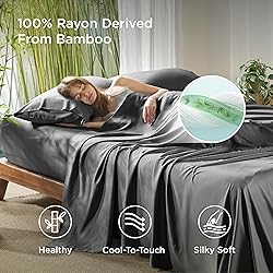 AWARD-WINNING COOLING: Made from rayon derived from bamboo, these cooling sheets reign supreme in breathability and moisture-wicking, and are endorsed by Forbes Vetted, NBC, and The New York Post. Banish sticky nights and enjoy cool, cozy slumbers 100% RAYON DERIVED FROM BAMBOO: Crafted from nature’s embrace, the sheet set is completely free of harmful chemicals, cool to the touch, and silky soft without irritating your skin. It proudly passes the OEKO-TEX Standard 100 certification(24.HCN.19195) IDEAL SLEEP COMPANION: Made from 100% rayon derived from bamboo, these bed sheets offer a cool, silky-soft feel. Perfect for hot sleepers, menopausal women, or babies. Available in a range of colors to match your style EASY FIT: Our fitted sheet fits mattresses up to 16" thick. The 360° elastic band ensures a secure fit, eliminating endless fussing. Plus, the envelope-closure pillowcases protect pillows from slipping out EASY CARE: Machine wash in cold water (below 104℉) and tumble dry low. Remove promptly or iron if needed to reduce wrinkles. For stains, pre-treat with laundry detergent instantly before washing. Do not bleach or dry clean to preserve fabric quality WHAT'S INCLUDED: This all-in-one queen sheet set includes a flat sheet (90" x 102"), a fitted sheet (60" x 80" + 16"), and two pillowcases (20" x 30"). Everything you need for a cozy bed setup, all in one package