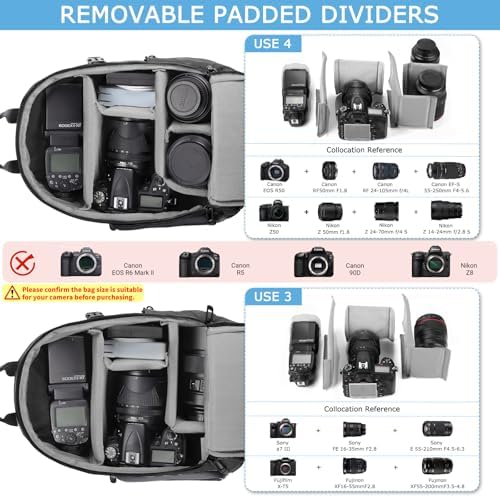 - This multifunctional camera bag is professionally designed for DSLR / SLR / Mirrorless cameras of different brands. Compatible with Canon EOS Rebel T7/R50/R6 Mark II/R100/R50 V/T6/R8/R10/R5 Mark II/RP/R7/SL3/R5/T100/80D/XTi/T7i/T6i/T5/T5i/5D Mark IV/6D Mark II/70D/XT/T3i/T3/SL2/R5 C/M50 Mark II/90D/M50 DSLR SLR Camera bag for Sony Alpha ZV-E10/a6400/7 IV/6700/a7 III/FX3/ZVE10 II/A6100/7R V/7C II/a6000 Camera bag for Nikon Z6 III/Z50 II/Z 6II/Z 8/Z 30/Z 7II/D7500/D850/D3500 Camera and Panasonic LUMIX FZ80D/G85 Camera and other standard-size DSLR.