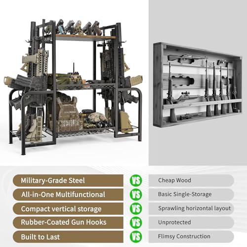 - DURABLE BUILD: Built with rifle rack-grade stainless steel,it offers unmatched rust resistance and heavy-duty support. Safely store 8 long rifle stands and 6 handguns, perfect for floor gun rack stand setups for rifle, shotgun, and hunting rifle.