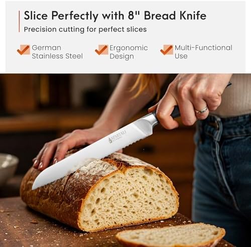 - 1. EFFORTLESS CUTTING WITH SERRATED EDGE: Engineered with a sharp, serrated 8-inch blade, this bread knife is ideal for slicing artisan loaves, baguettes, sourdough, and crusty breads. Its precision serrations glide through hard crusts without tearing or squashing soft interiors, delivering bakery-quality slices at home. Designed to handle dense textures and delicate crumbs with ease, it's an essential for any serious baker or bread lover.