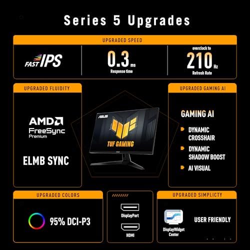 ASUS TUF Gaming 27” 1440P Monitor (VG27AQ5A) – QHD (2560 x 1440), 210Hz (OC), 0.3ms, Fast IPS, Extreme Low Motion Blur Sync, FreeSync Premium, Speakers, DisplayWidget Center, Gaming AI, 3 yr Warranty