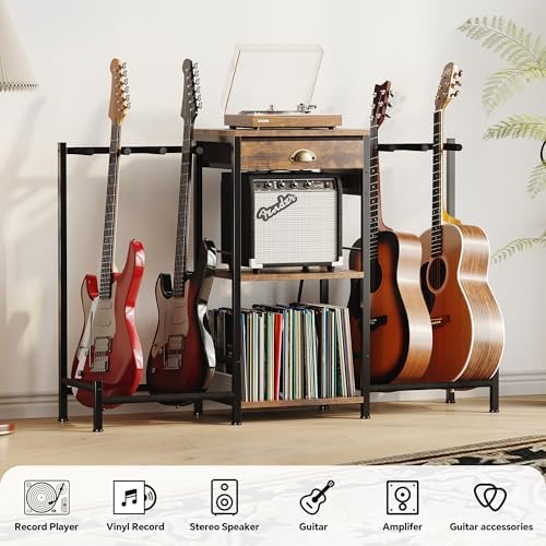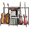 6-Guitar Floor Stand with Charging Station & 3-Tier Storage, Guitar Rack with Amp Stand & Cloth Drawer, Rubber Protected Guitar Holder for Studio/Home , Heavy Duty Metal Frame"