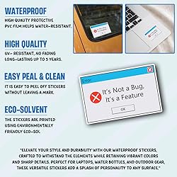 - 3Pcs It's Not A Bug It's A Feature Sticker Funny Programmer Coding Humor IT Developer Tester Life Computer Programmer Debugging Stickers Decal for Laptop Water Bottle Toolbox Phone Case Cars 3" Waterproof: Our sticker is ideal for use in damp or muggy conditions because it is made to be totally waterproof. Applying it to surfaces like water bottles, car windows, and even boats can be done with confidence. UV Protection: Our outdoor stickers offer protection against UV rays from exposure to sunlight, rain, and wind, among other factors that qualify them for outdoor use. Durable: The premium vinyl used to make the stickers is intended to be weather- and scratch-resistant. It is designed to endure years in the weather. Precision die-cutting: With the use of cutting-edge die-cutting technology, your design is accurately, crisply, and cleanly cut out of our sticker. Additionally, this technology makes it simple to modify the sticker to meet your unique design requirements. Versatile: You can use our sticker on a lot of different things, such as water bottles, laptops, cars, and more. Furthermore, it is appropriate for both indoor and outdoor use due to its waterproof qualities. Easy to apply: No special tools or techniques are required to apply our sticker; it is designed to be that simple. Simply peel off the backing and apply it to any smooth surface. Furthermore, it is simple to remove the sticker without leaving any trace.