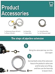 - With accessories: It comes with a valve core key/an extension Hose (40 inch)/a valve core/two hose Clip, which are used to extend the inflation distance. All accessories linked with the pipe plug so that they can be used immediately when it required