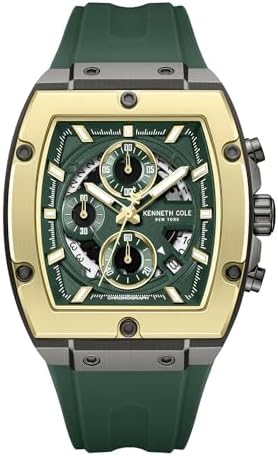 Kenneth Cole New York Men's Chronograph Watch – Gunmetal Tonneau Case with Green Dial, Gold-Tone Screwed Bezel, Date Display, and Green Silicone Strap