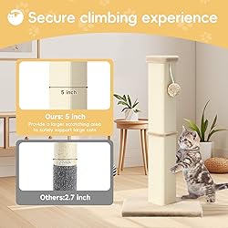 5 inch large diameter: Our Cat Scratch Post for Indoor Cats has a 5 - inch - wide pillar diameter, offering a larger and more satisfying scratching area for your cats. Suitable for cats of all ages: The height is nice, the length is nice so the cats can stretch, and the scratching post is the perfect height to place next to their stairway post/railing. It's the perfect size for adult cat. Size:15.7”*32” High-quality material: The natural sisal rope is absolutely appealing to cats, satisfying their natural instinct to scratch while protecting expensive furniture. The base tower is heavy-duty particleboard, covered with soft plush, and handcrafted Protect your furniture: By understanding that scratching is a natural instinct for cats, our scratching post effectively redirects your cat's attention to a designated spot for scratching Easy assembly: The pet activity is structured and easy to assemble. it goes smoothly and quickly, and the tools needed are included. The tall cat scratching post takes less than 5 minutes to set up