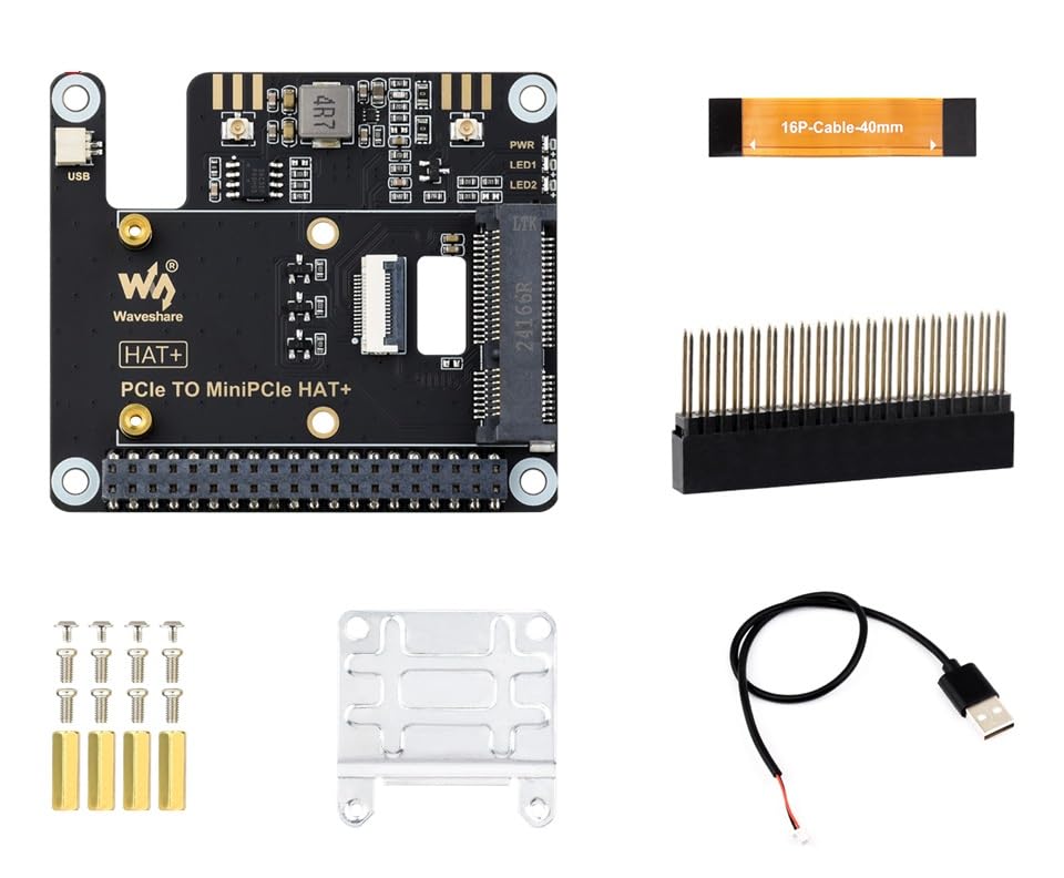 Introduction It is a PCIe to M.2 E key HAT designed for Raspbery Pi 5, compatible with various 2230 size NGFF (M.2 E Key) Wi-Fi NICs and supports Gen2 and Gen3 modes. Features ● Compatible with various 2230 size NGFF (M.2 E Key) Wi-Fi NICs. ● PCI-E×1 Gen2 or Gen3 mode. ● Only supports PI5B. ● On-board working indicator, PWR stays on when powered on. Package Content 1. PCIE TO M.2 E KEY HAT+ x1 2. Screws pack x1 3. IPEX 1 to IPEX 4 adapter cable ~6cm (2pcs) x1 4. 2*20 Pin header x1 5. Type-A to SH1.0 2Pin cable x1 6. 16P-Cable-40mm x1