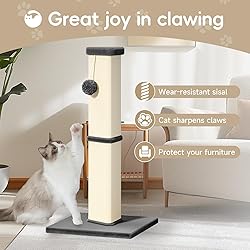 5 inch large diameter: Our Cat Scratch Post for Indoor Cats has a 5 - inch - wide pillar diameter, offering a larger and more satisfying scratching area for your cats. Suitable for cats of all ages: The height is nice, the length is nice so the cats can stretch, and the scratching post is the perfect height to place next to their stairway post/railing. It's the perfect size for adult cat. Size:15.7”*32” High-quality material: The natural sisal rope is absolutely appealing to cats, satisfying their natural instinct to scratch while protecting expensive furniture. The base tower is heavy-duty particleboard, covered with soft plush, and handcrafted Protect your furniture: By understanding that scratching is a natural instinct for cats, our scratching post effectively redirects your cat's attention to a designated spot for scratching Easy assembly: The pet activity is structured and easy to assemble. it goes smoothly and quickly, and the tools needed are included. The tall cat scratching post takes less than 5 minutes to set up