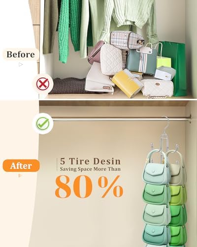 - Maximize Your Space:Tired of digging through a messy closet every morning? Meet your new space-saving hero — our 5-Tier Purse Organizer!Smart vertical design holds 10+ bags in half the closet real estate. Each sturdy tier securely stores 10 purses at perfect eye-level visibility