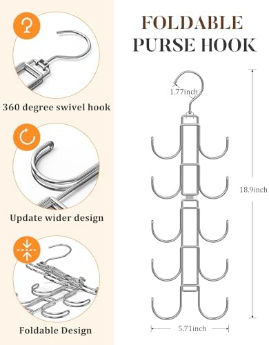 - Purse Storage for Closet: Tired of dusty & Squished Bags?:10 big hooks hold purses vertically - protect designer handbags from deformation & dust, while letting You elevate your storage game while reclaiming precious space,sleek vertical storage guards against dust and deformation, while transforming cluttered chaos into a luxe boutique display