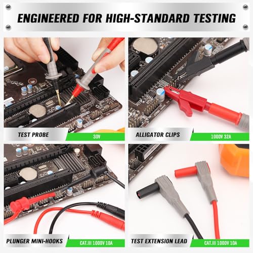 - CERTIFIED HIGH SAFETY – Rated CAT.III 1000V and CAT.IV 600V, this multimeter test lead kit supports up to 10A, offering safe, dependable testing for voltage, continuity, and resistance across electrical, automotive, and industrial