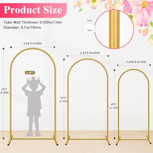 Metal Arch Backdrop Stand, Set of 3 (4/5/6 ft) Wedding Arched Frame with 12 Ground Nails, Stable Arched Background Stand for Wedding, Baby Shower, Birthday Party, Photography, Gold