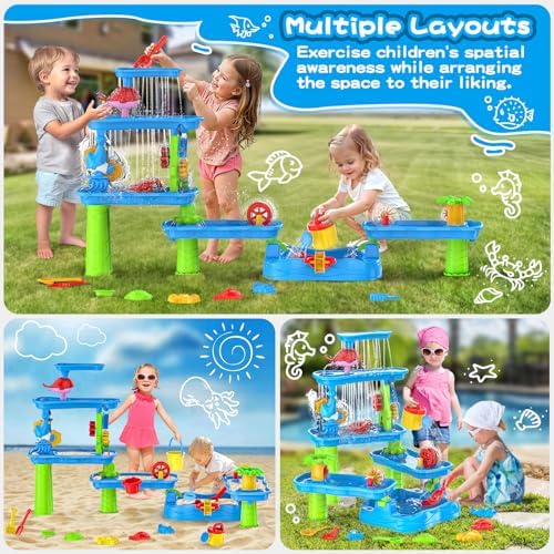 Water Table for Kids Ages 3-5 4-8, 6-Tier Rotatable Rain Shower Splash Pond Toddler Water Table with 13Pcs Sand Toys, Outdoor Sensory Toys for Summer Beach Backyard Activity