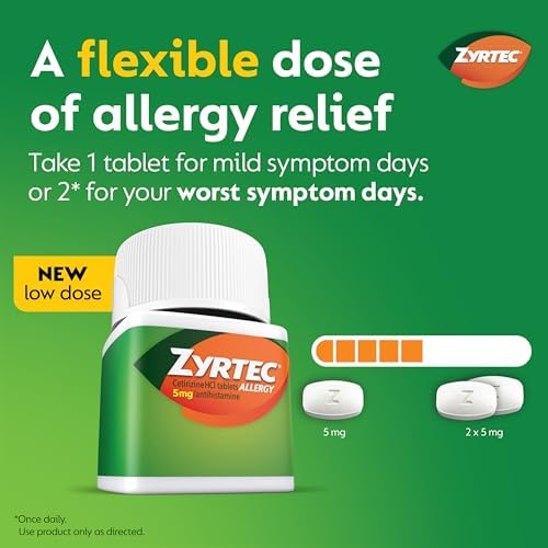 Zyrtec 5mg 24 Hour Allergy Medicine for Adults comes in a 35-count bottle and delivers 5 mg cetirizine hydrochloride per tablet to provide up to 24 hours of relief from light to moderate indoor and outdoor allergy symptoms associated with hay fever and other upper respiratory allergies. This allergy medicine for adults and children ages 6 and up treats common symptoms including runny nose, sneezing, itchy or watery eyes, and itching of the nose or throat, and it targets both indoor allergens—dust, mold, and pet dander (including dog and cat dander)—and outdoor seasonal triggers like tree pollen, weeds, and grasses. From the #1 allergist-recommended brand among OTC oral antihistamines, these cetirizine HCl tablets offer flexible, once-daily dosing so you can match the severity of your symptoms: take one tablet (5 mg) on milder days and two tablets (10 mg) on more severe days; adults 65 and older should take one tablet once daily. As antihistamines for adults, Zyrtec tablets work to block the effects of histamine, supporting relief so you can go about your routine whether you’re spending time indoors or navigating high pollen counts outside. Some users achieve peak relief after a few days of consistent daily use, and maintaining a regular dosing schedule helps support full-day control; individual response can vary. The compact 35-count size makes it easy to keep a bottle at home, in a travel bag, or at the office, and it’s available over the counter without a prescription for convenient access to trusted allergy meds. If pet dander is a concern, these cetirizine allergy pills help with dog and cat related indoor triggers, while also addressing seasonal exposures throughout the year. Choose Zyrtec to manage everyday allergy symptoms with precise cetirizine dosing, clear guidance for adults and children 6+, and once-daily scheduling designed for reliable relief.