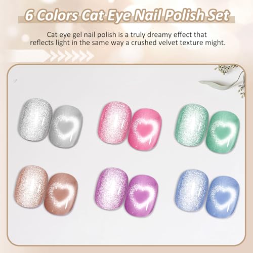EBANKU Cat Eye Gel Nail Polish, 6 Colors Ceramic Magnetic Gel Polish Set with Magnet Stick, Crystal Shimmery Silver Pink Green Purple Colors Nail Polish Soak Off Nail Art Salon Home Gift for Women