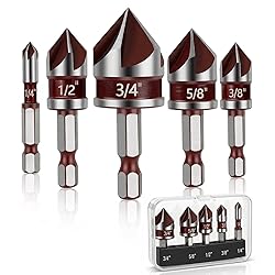 Multiple Size Options: The drill bit set includes five commonly used sizes of countersink drill bits: 1/4 inch, 3/8 inch, 1/2 inch, 5/8 inch, and 3/4 inch. All sizes are clearly marked, facilitating quick selection of the appropriate specification according to different work requirements and meeting the diverse needs of various projects. Sturdy and Long lasting: This countersink drill bit is made of quality high-speed steel. It features high hardness, strong heat resistance, ensuring long-term stable performance in repeated drilling and countersinking operations. It is recommended to apply oil for maintenance after each use. Wide Compatibility: This countersink drill bit set features a 1/4-inch hex shank design, allowing easy installation into the drill chucks of most handheld and bench drills without additional adapters. Its convenient operation provides great convenience for woodworkers and DIY enthusiasts. Precise and Efficient: The 82 degree countersink angle combined with five sharp flutes enables rapid and accurate deburring, chamfering, and countersinking operations on materials such as wood, metal, and plastic (not suitable for stainless steel), ensuring that screws and bolts are neatly embedded. To achieve the best countersinking effect, it is necessary to drill a pilot hole in advance. Wide Compatibility: This countersink drill bit set features a 1/4-inch hex shank design, allowing easy installation into the drill chucks of most handheld and bench drills without additional adapters. Its convenient operation provides great convenience for woodworkers and DIY enthusiasts.