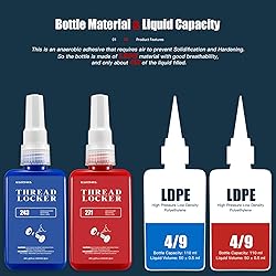 Lock Tight Screws Thread Locker: Can fasten bolts & nuts for a long time to avoid loosening due to vibration or shock, Even in extreme environments such as high vibration, high humidity, ultra-high or ultra-low temperature. A must-have for extending the service life and safe use of metal fasteners! Permanent Locking & Easy Disassembly: Both Blue & Red Threadlocker can Permanently lock tite Fasteners due to Their Stable Chemical Properties. Red Threadlocker Require Heating due to Their High Disassembly Torque to be Disassembled with Tools, While Blue Threadlocker can be Disassembled with Tools at Any Time. Prevents Rusting / Corrosion / Leakage: Unique anaerobic solidification function of flowing liquid ensures tight contact and perfect sealing of bolts & nuts. Avoid the additional cost of purchasing various specifications of washers and traditional locking screws. Widely Used: Suitable for Tightening and Maintaining all Metal Screws Below M32, including Automobiles, Motorcycles, Bicycles, Furniture, Household Appliances, Electronic Digital Products, Industrial Equipment, etc. Only Need a Bottle of Thread Locker to Ensure the Normal & Safe Operation of your Equipment. Simple Operation: Just apply a dab of the thread locker to the fixing position of the bolt & nut, And then it will Start to Cure in 10 Minutes, And your items can be used normally after 24 hours of fully cured. The peak nozzle design with pull-up opening and downward pressure sealing can easily maintain the long-term effectiveness of the glue and enable precise and controllable application.