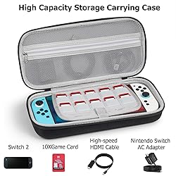 [No More Cramped Storage] This large carrying case features a uniquely taller compartment to maximize storage space,including a mesh pocket suitable suitable for Switch 2 accessories (HDMI cable, Joycon straps,headphones, cables, etc.) and dedicated slots for up to 10 game cards. Everything stays neatly organized with room to spare. [Engineered for Protection] Built with a thickened EVA hard shell exterior and a plush microfiber-lined interior, this case provides complete protection suitable for your Switch 2. The portable case hard shell protects against drops, scratches, and dust, while the soft interior lining and Velcro strap secure your console, preventing accidental movement and screen damage,shields your suitable for Switch 2 from scratches, spills,and daily wear-and-tear—making it the ideal travel companion. [Designed for Effortless Use] The snag-free, silky-smooth zipper allows one-handed access,Unique handle design, more stylish and convenient.Remarkably lightweight yet durable, this sleek carrying case fits effortlessly into backpacks, messenger bags, or carry-on luggage—offering the perfect combination of functionality and style. [Designed specifically for Switch 2] Precision-molded interior hugs your suitable for Nintendo Switch 2 (2025) securely with custom grooves, ensuring a perfect fit & preventing scratches during travel. even with a protective case on, this TIGOJH carrying case ensures a perfect fit and superior protection.Dedicated compartments hold the console snugly, making this protective switch2 case essential for gamers on the move. [The Perfect Gift suitable for Switch 2 Gamers] It features a sleek, modern design that perfectly matches the aesthetics of suitable for Switch 2, making it an ideal gift for birthdays or holidays. An excellent choice for friends and family who love gaming, offering both style and functionality in one thoughtful package.