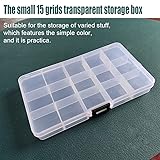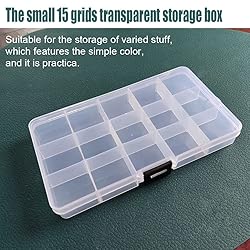 The storage box size is 17.4cm/6.8inch L x 9.8cm/3.86inch W x 2.2cm/0.87inch H, and the grid size is 3.3cm/1.3inch L x 3cm/1.18inch W x 2.1cm/0.83inch H. 4 pack 15-grid detachable storage box Made of Eco-friendly PP hard plastic. It is durable, sturdy and break-resistant.if it drop, do not worry, dividers are tight enough, nothing gets mixed up The dividers inside the box can be moved, so you can adjust the dividers to create your own size compartments Clear and transparent, allow you to check the content of the storage box at a glance without opening the case. it is convenient for you to see and pick Perfect for organizing and storing small items: hreads, beads, fishing hook, fish lure bait, letter board letters, small accessories, earrings, rings, necklace, tsmall drugs, pills, electronic components, art DIY crafts, nails, nuts and bolts, etc.