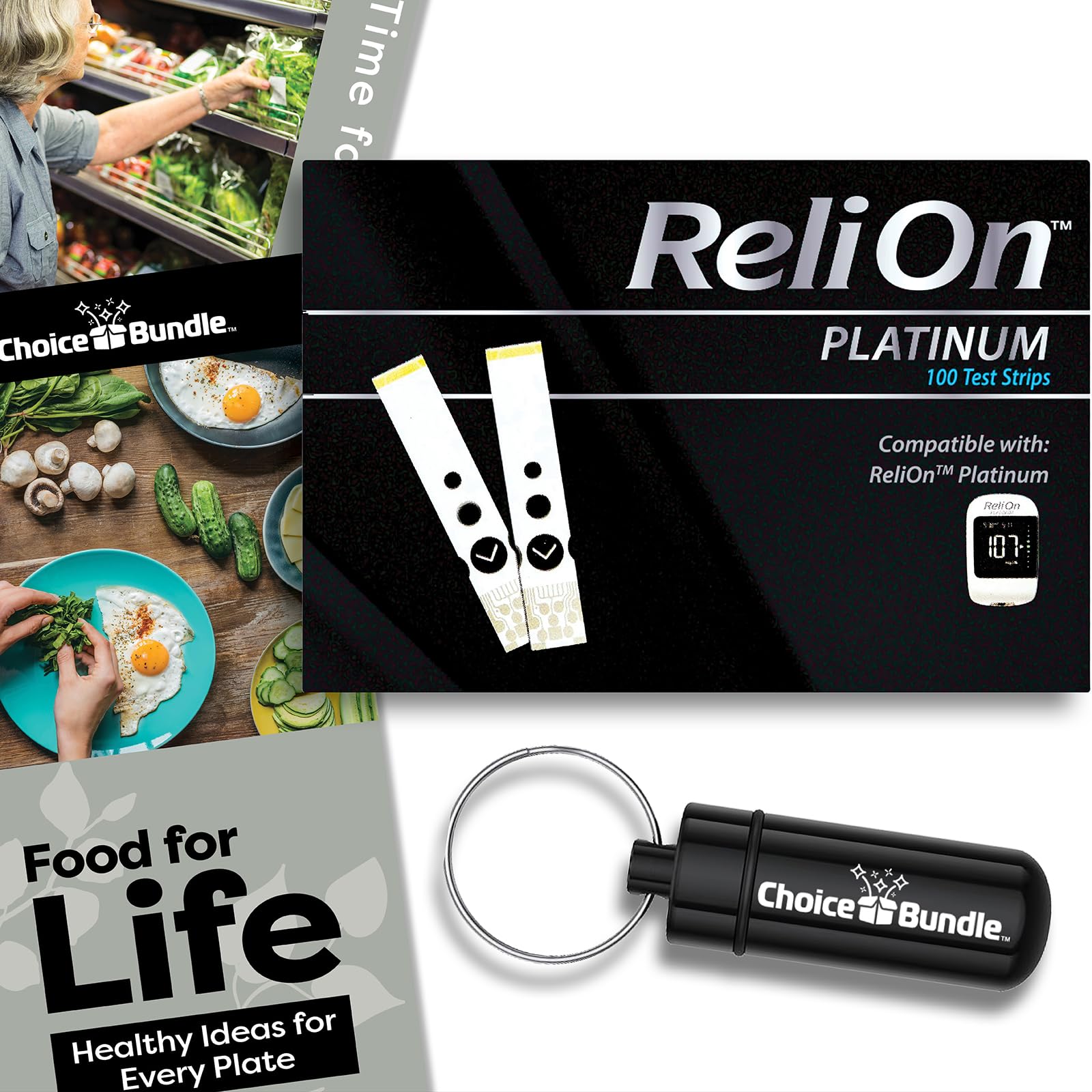 ReliOn Prime Blood Glucose Test Strips 100 Ct Reli On Choice Bundle Plus Food for Life & Portable Pill Holder (3 Items)!