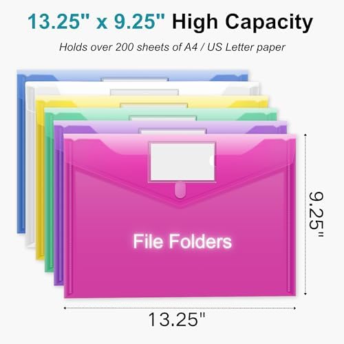 - FITS 200+ SHEETS EASILY: Each 13.25" x 9.25" plastic envelope pouch fits over 200 A4/Letter papers. Perfect for sorting documents, homework, receipts, or business files. Great for office folders, classroom paper, or travel storage.