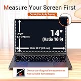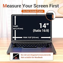 Fitment Model: The laptop anti blue light screen filter designed for 14 inch16:9 screen compatible with Lenovo/Dell/Acer/Asus/ Samsung/Toshiba and other laptop brands. Compatible with HP Pavilion X360 14/HP Chromebook 14 inch Laptop/HP 2019 2018 Stream 14 Inch/Envy 14" and 14.1" laptop, Width:12 3/16 inches (310 mm), Height: 6 7/8 inches (175 mm), Diagonal: 14" (355.6mm), kindly check your screen width and height measurements and not recommended to make your selection based solely on screen's diagonal size Upgraded Anti-blue Light Blocking Technology for: Crafted from unqiue technology effectively reduces blue light and UV, Blocks harmful screen rays while cutting reflective glare, maintains true-to-color visuals with quality 6-layer films, prevents digital eye strain for all-day comfort Anti-Scratch: This laptop blue light screen protector featured with PET screen protector features 9H hardness to resist scratches and abrasions, reduces fingerprints and smudges, facilitating effortless cleaning Bubble Free Installation: Clean the screen with attached tools and ensure it is dust-free, align the protector to screen and it will adhere perfectly in seconds without leaving air bubbles All-round Eye Protection: The 14.1 inches computer monitor screen protector can effectively reduce harmful blue rays and glare, release eye strain for long-time computer users, including programmers, students, travelers,web developers, and e-commerce pros in all scenerios including work/travel/home
